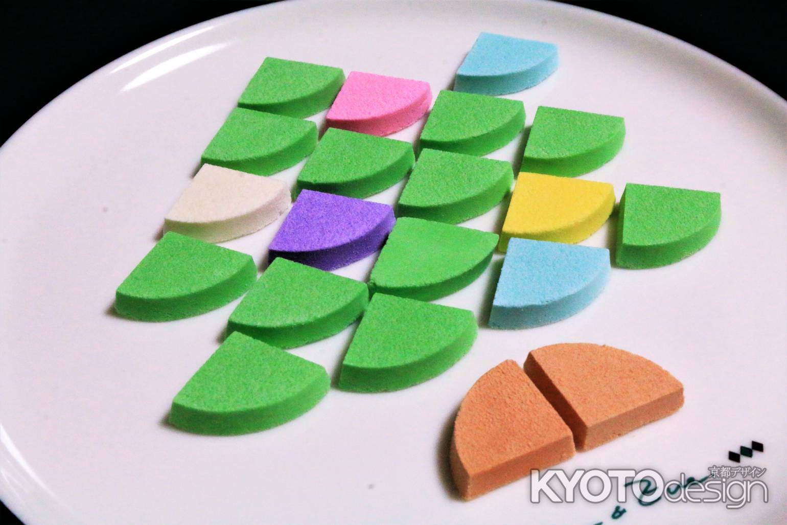 落雁のイメージが変わるくらいの斬新な形と色合いです。でも、和三盆糖の風味と口どけは、間違いなく上質の落雁です。様々な季節に合ったバージョンがあります。写真は、クリスマスバージョンでした。お店は、寺町店と京都タワー内にあります。2010年開業のUCHUさんは、これからも落雁の名前を重んじながら、新しい挑戦をしてくれるかも。