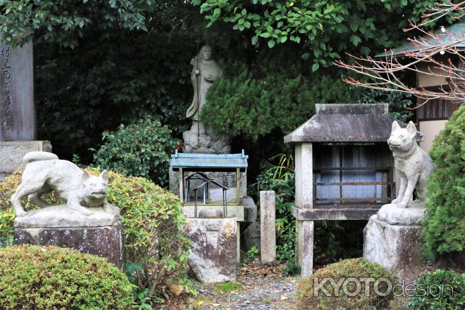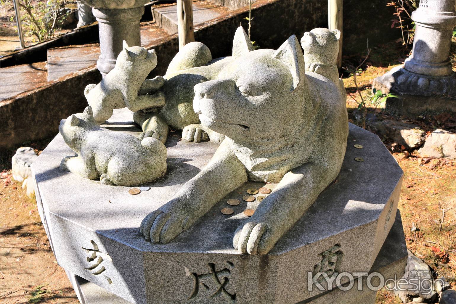 鳴滝の妙見さまとして知られる三宝寺。戌年の守り神としても信仰があついところです。奥の階段を登りきる、その少し手前に、母犬とかわいい3匹の子犬たちの像があります。子宝犬の像ともいわれています。最近は、ペット供養のお寺としても知られているようです。