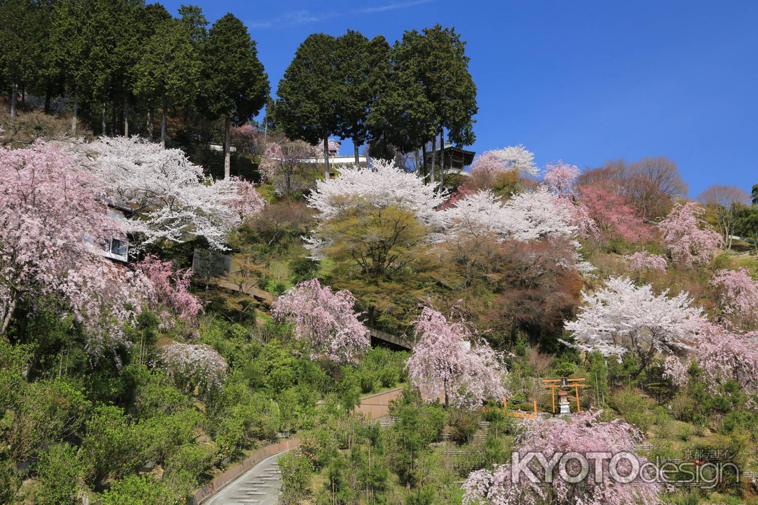 四月、山々は彼岸桜、しだれ桜、山桜、ぼたん桜などで桜色に染まります。境内にも100本以上の桜があり1ヶ月近く桜を楽しむことが出来ます。