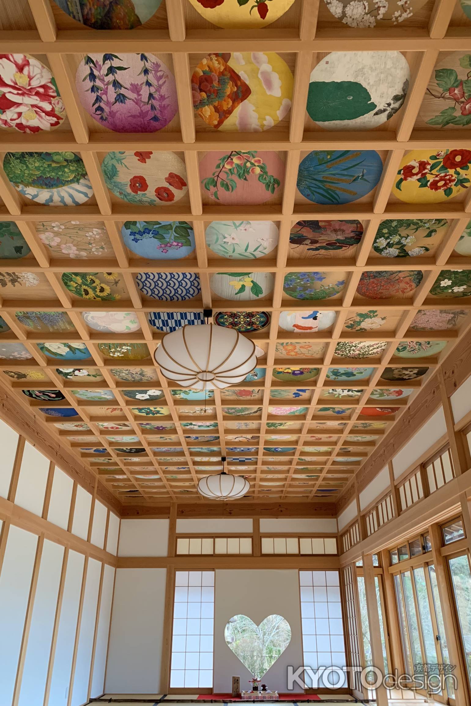 90名の日本画家が、天井画の1枚1枚に字と蓮を描きました。