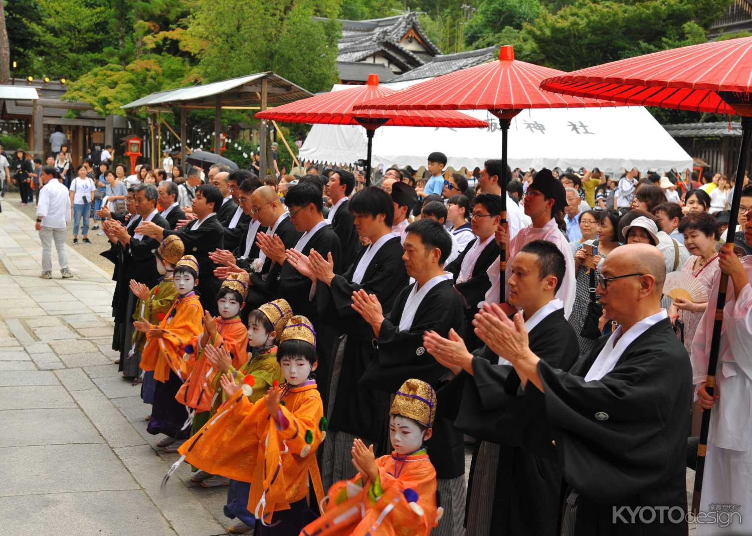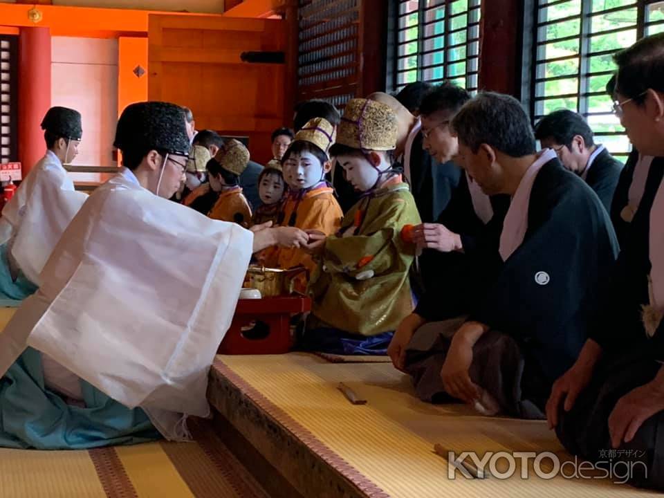 八坂神社常磐神殿にて稚児社参の前に綾傘鉾保存会の役員とお稚児さん6名とで結納の儀を執り行います。
