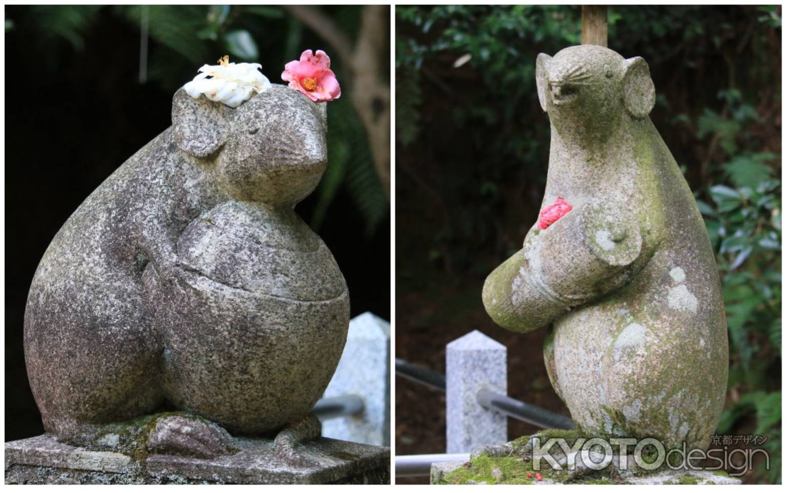 哲学の道沿いにある大豊神社。狛ねずみさんがいることで、よく知られています。お参りするときの左側に、「豊穣」を表す「水玉」を、右側に「学問」を表す「巻物」を、それぞれ抱えています。少し変わった狛さんがいますので、ゆっくり見てまわってください。