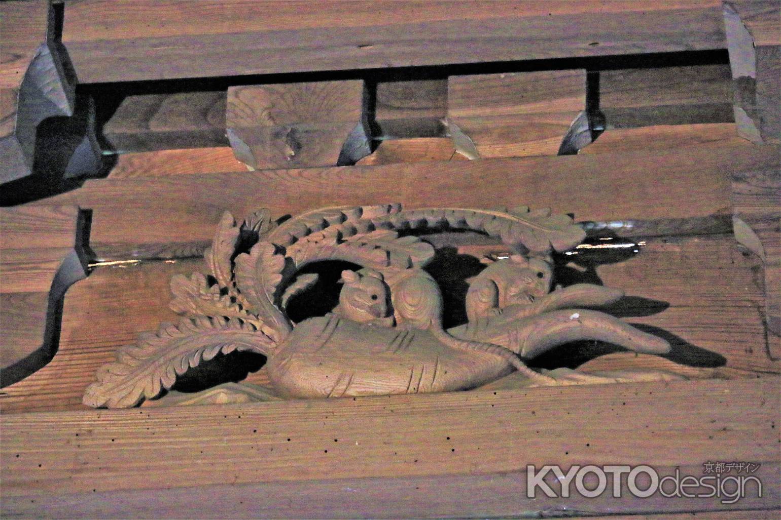 福知山にある長安寺、もみじの寺として知られています。ほんとに、全山もみじの木々に囲まれています。ここの、薬師堂内に、りっぱな龍の彫り物がありますが、十二支の動物たちも、それぞれ彫られています。ねずみさんは、大根の上に乗っかっています。