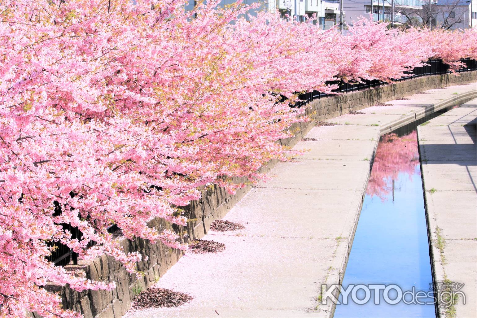 淀駅から数分のところにある水路沿いの河津桜。いいお天気の日には、たくさんの人で賑わいます。比較的新しい桜並木ですが、約200本が咲き誇る様は、素敵です。
