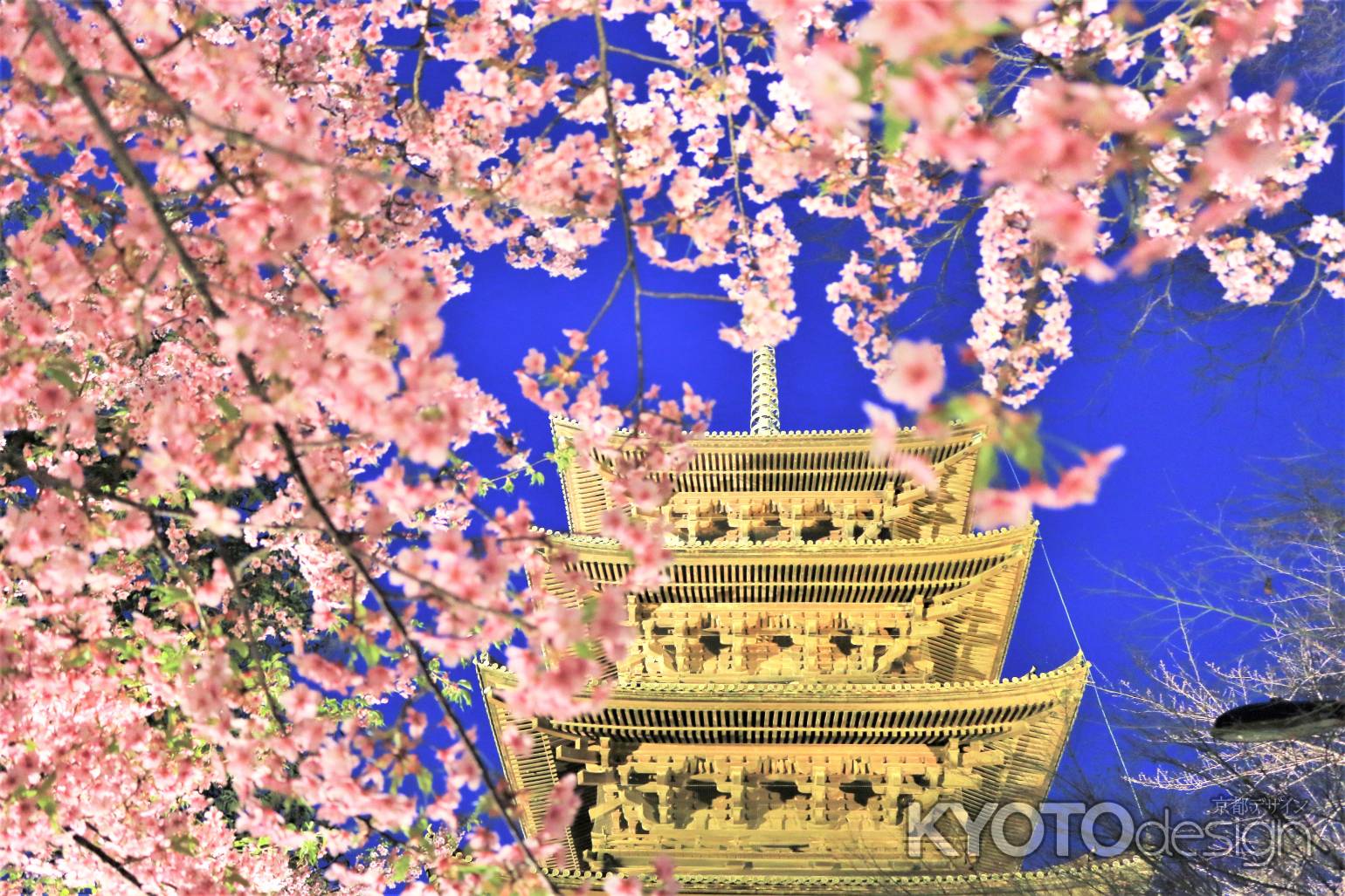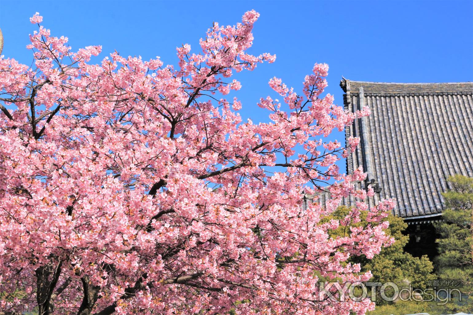 東寺にも、五重塔近くなどに河津桜の木が数本あります。ソメイヨシノやしだれ桜の咲く前なので、人も少なく、ゆっくり眺められます。