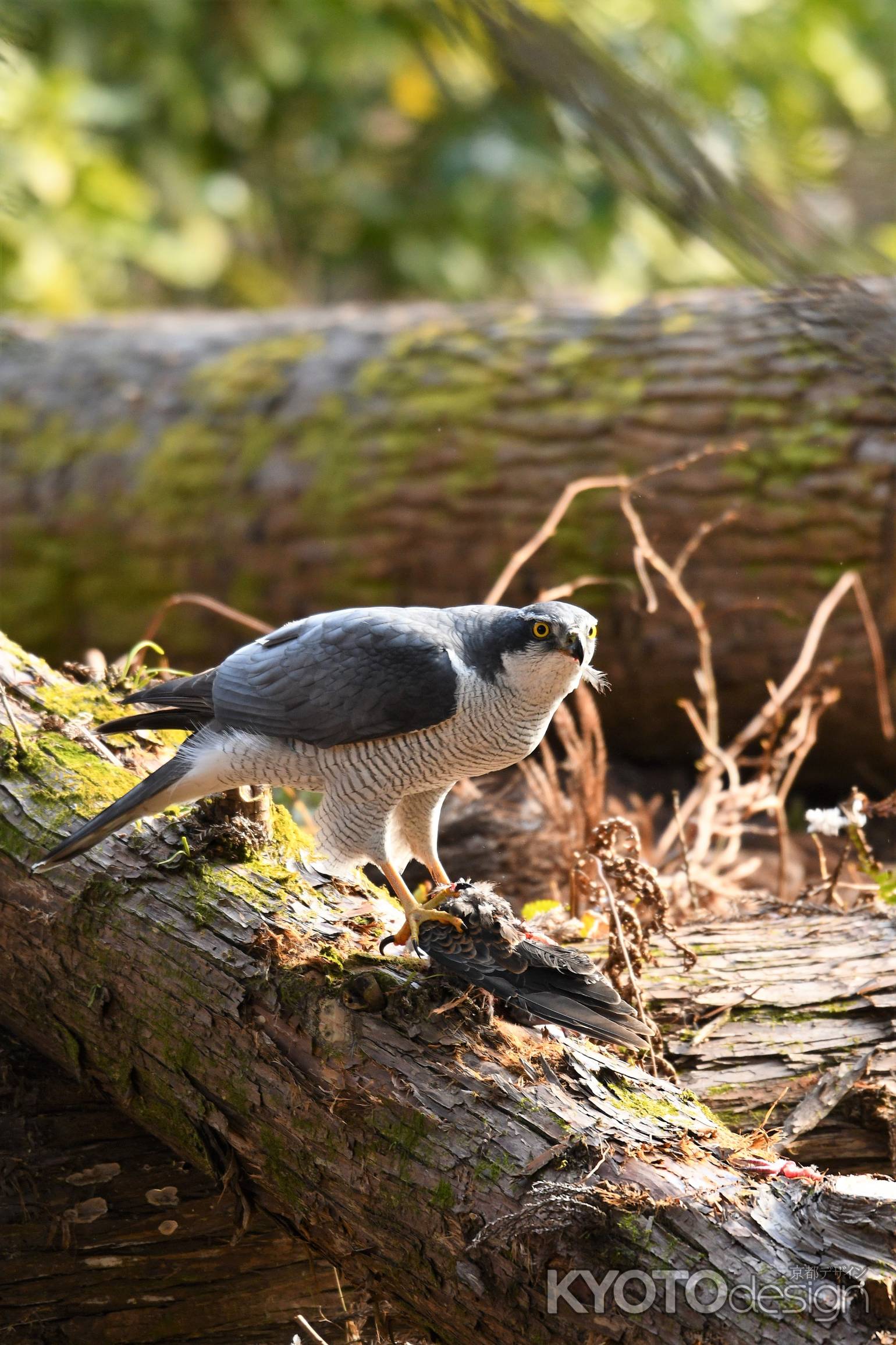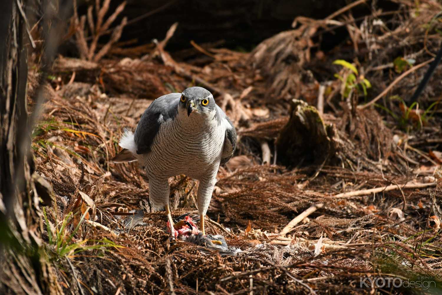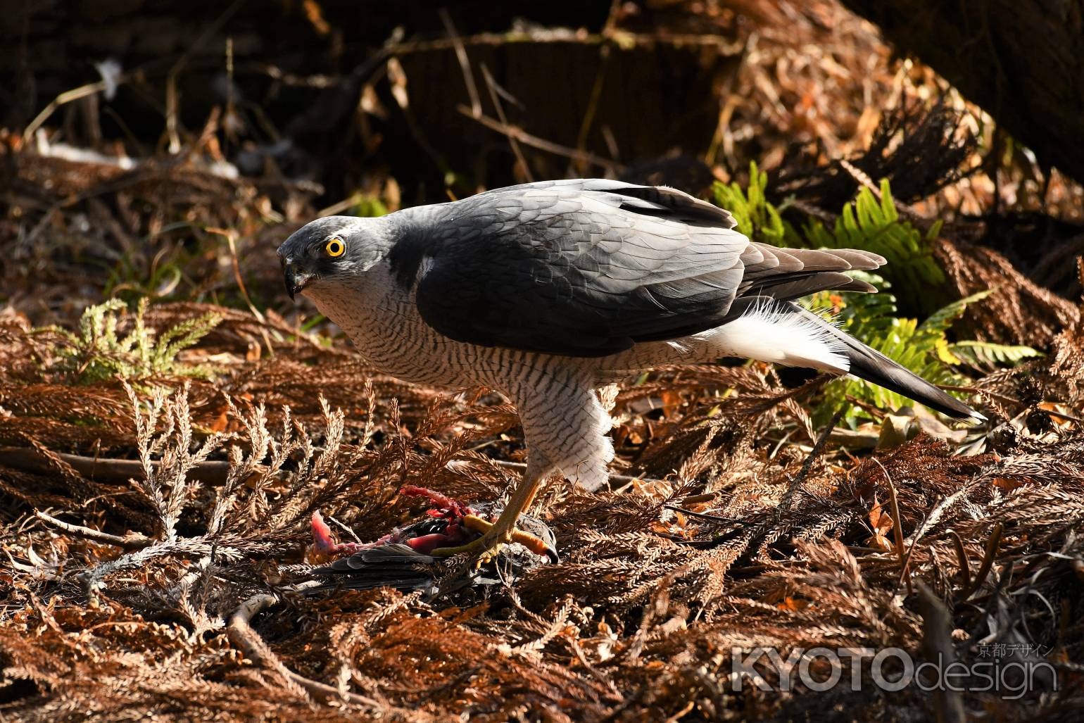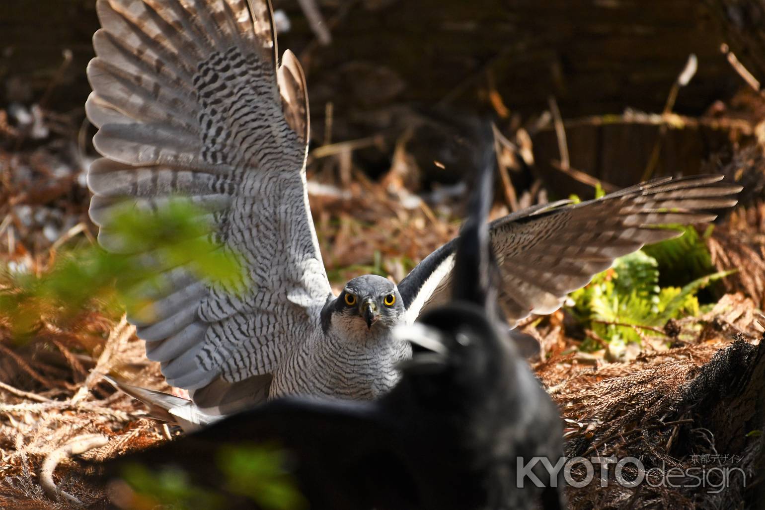 捕獲したハトだと思われる鳥を捕食しているとカラスがおこぼれをいただこうと
