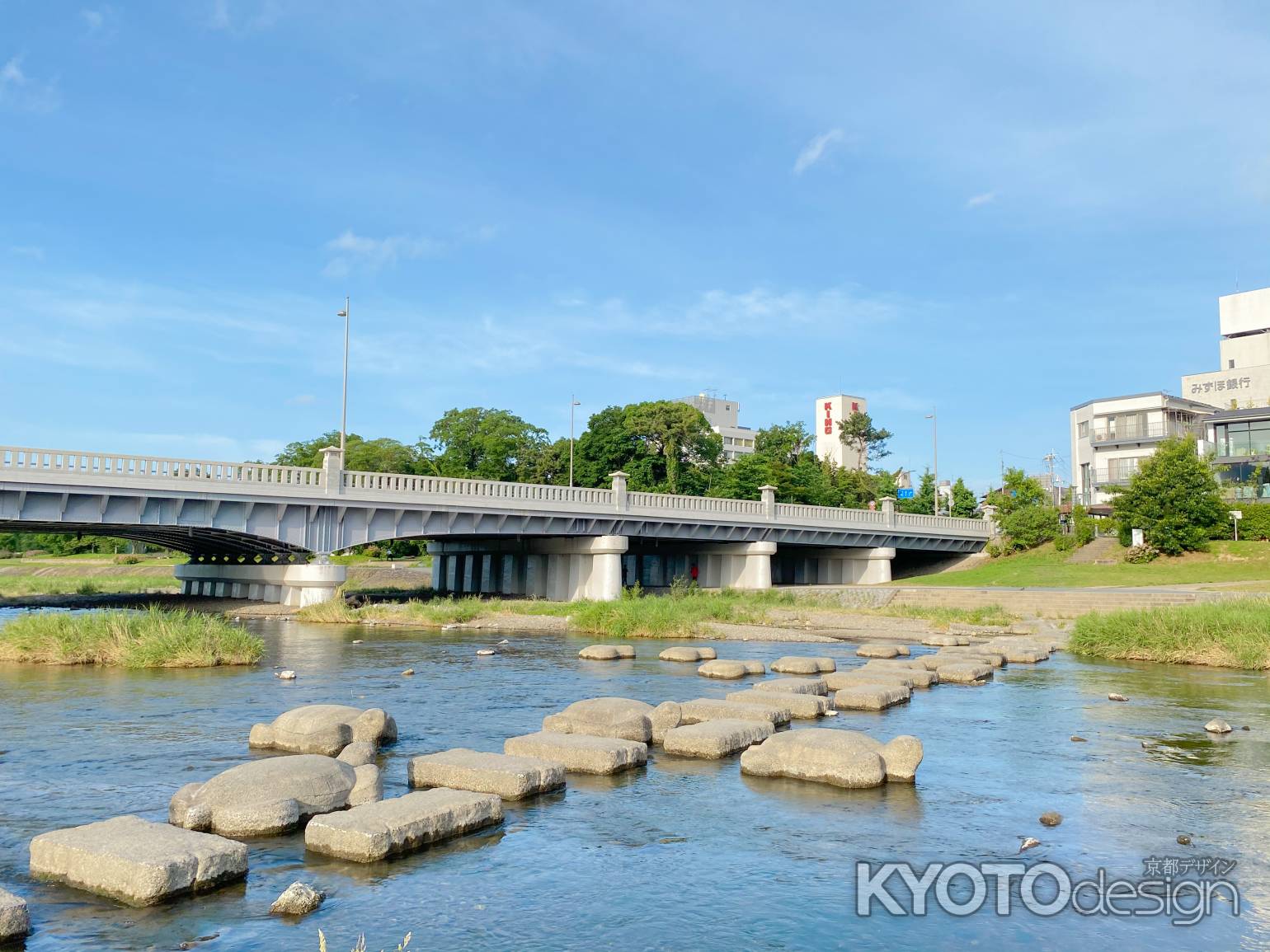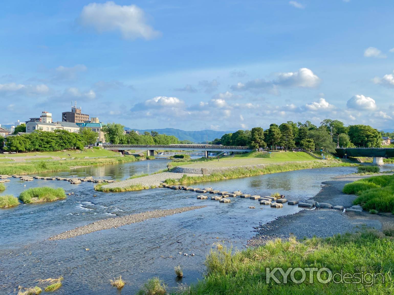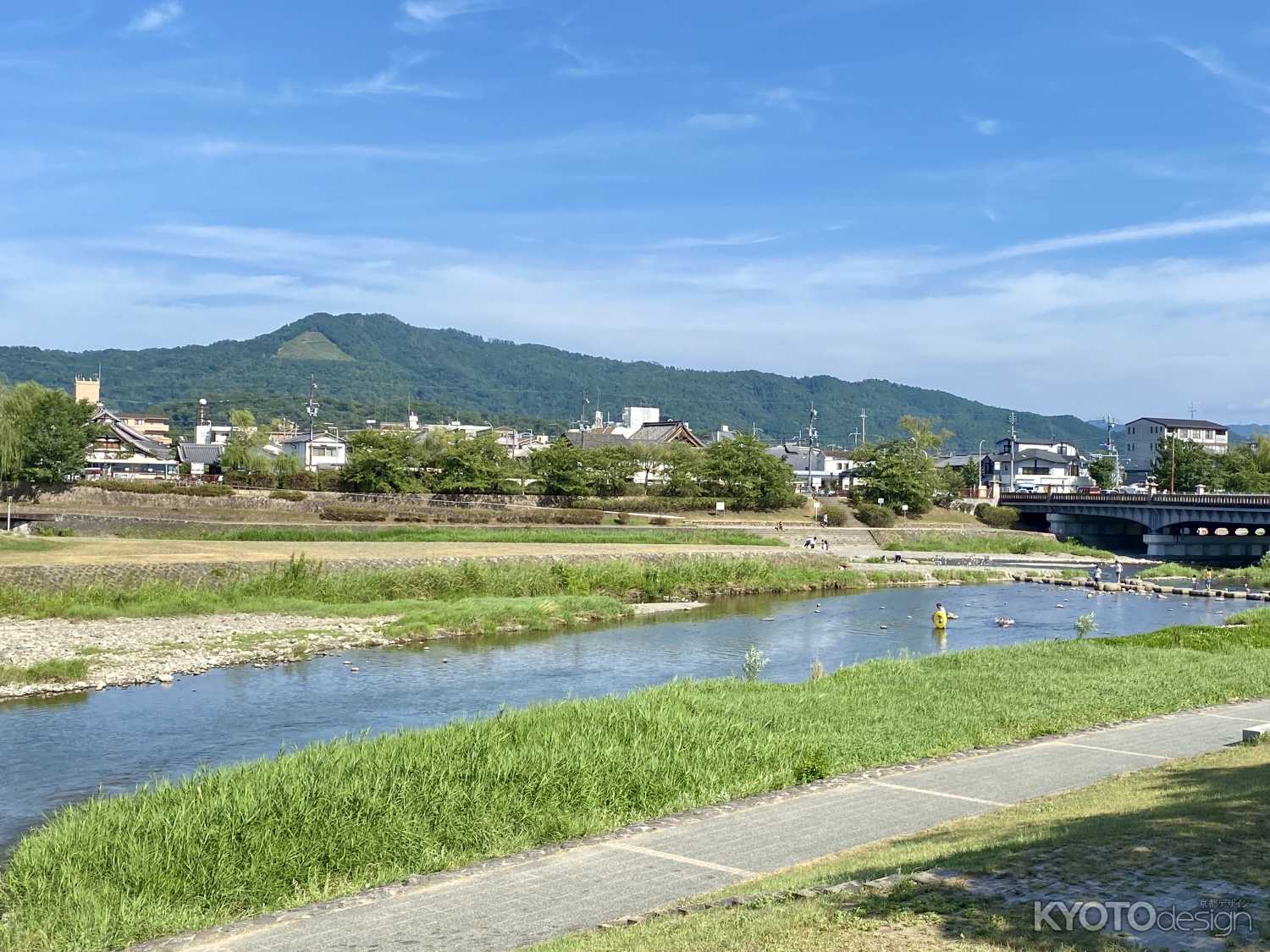 東には京都の夏の風物詩,五山の送り火で知られる大文字山を眺めながらゆったりできます。飛び石を渡れば,簡単に対岸にも行けちゃいますよ。