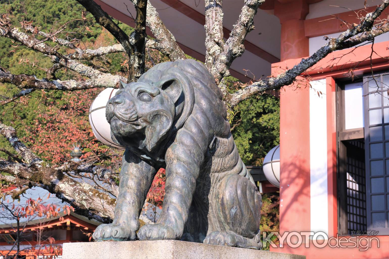本尊のひとつ毘沙門天が、「寅の月、寅の日、寅の刻」に鞍馬山へ出現したことにちなみ、毘沙門天の使いである虎を、本殿前に阿吽の寅として安置されています。独特の姿の虎です。