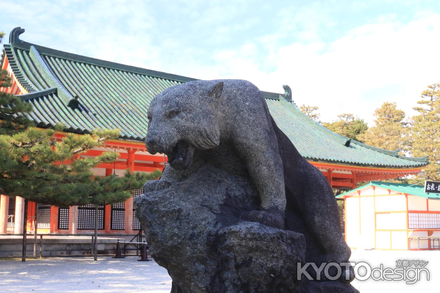 初詣でたいへんなにぎわいの平安神宮ですが、応天門をくぐり左手に狛虎が安置されています。ちなみに、右手は龍です。