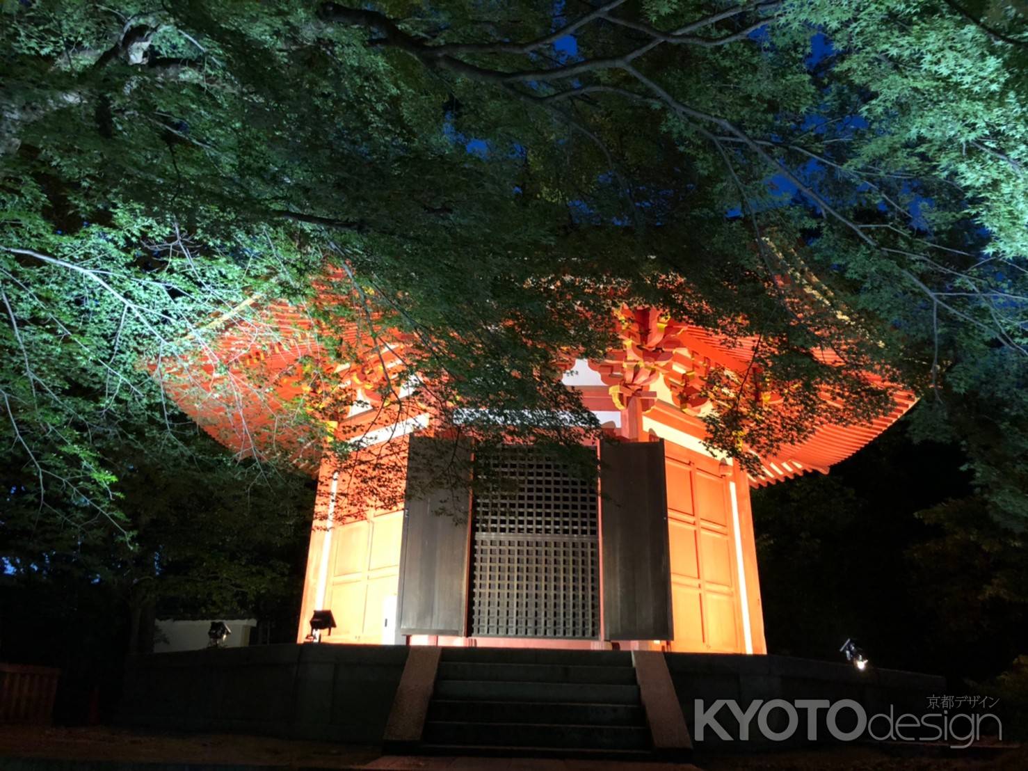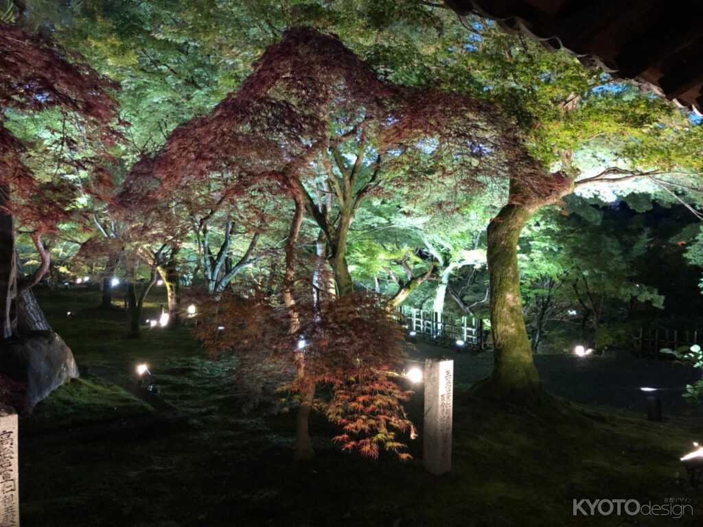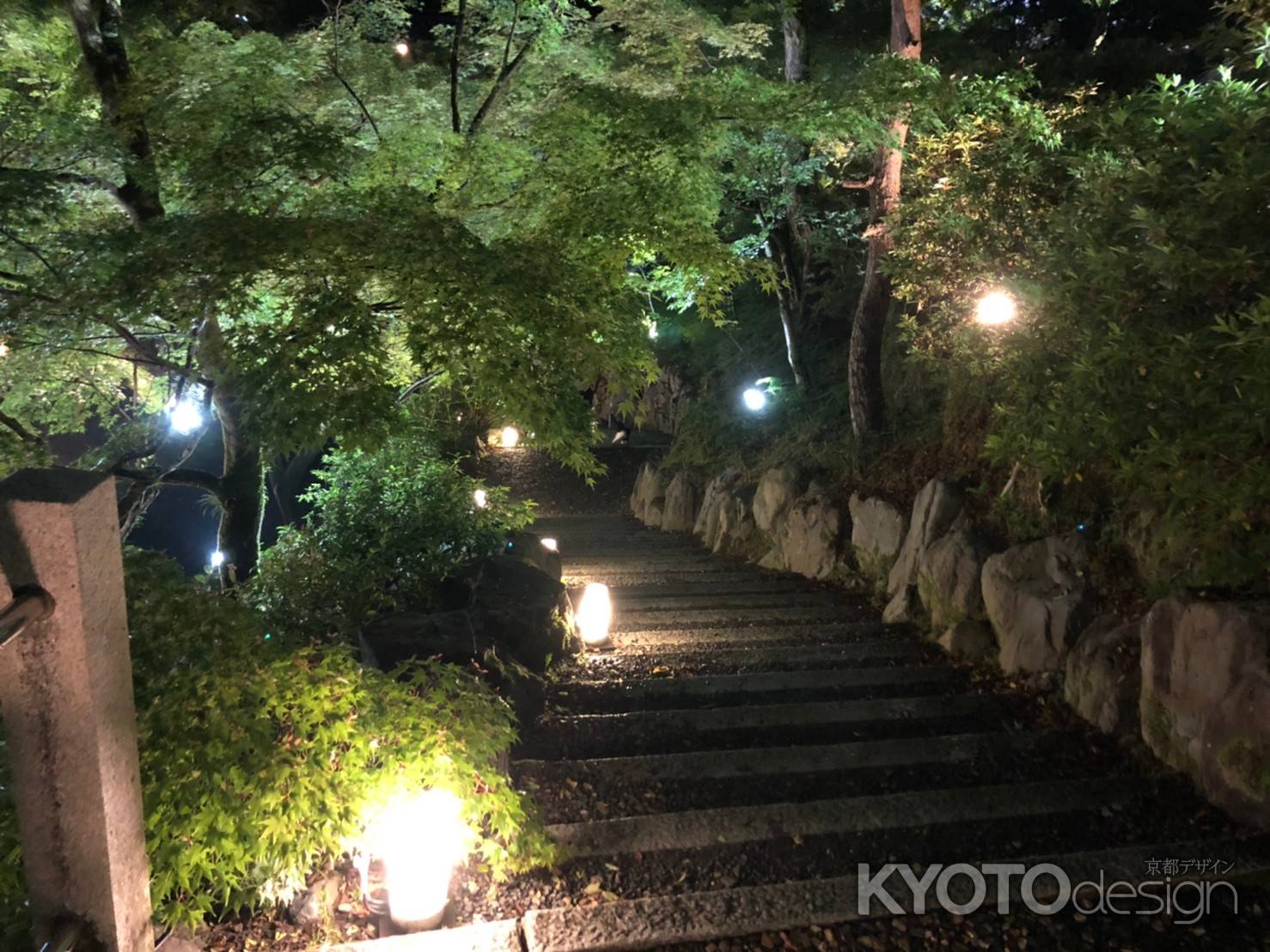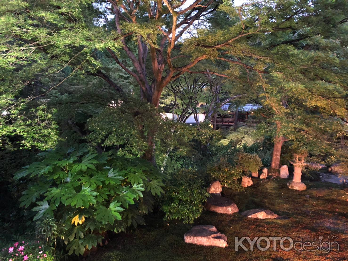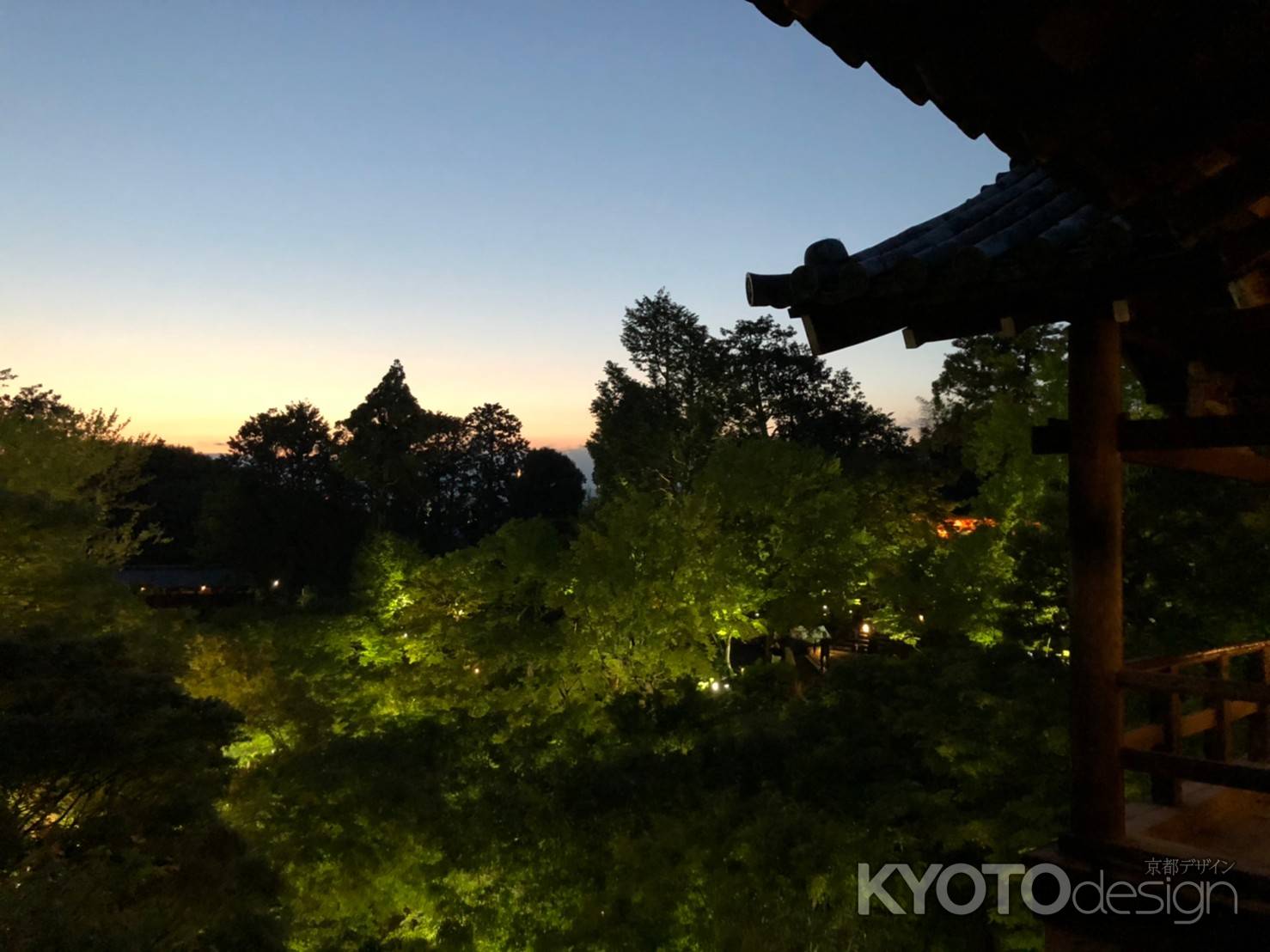 秋の紅もみじのライトアップは、言わずもがなの美しさですが、濃淡入りまじった緑に光が映える今回のこの青もみじも必見。とくに日が完全に落ちる前、あたたかな夕日の差すなかに、薫風を感じながらの散策も一興です。徐々に暗くなっていく美しさの変化も素敵ですね。