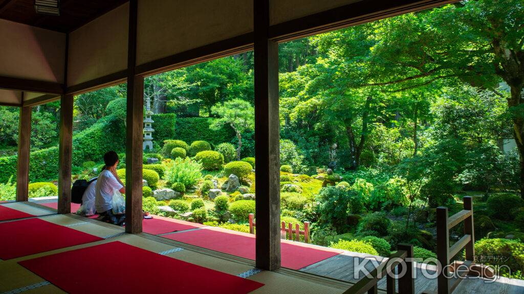 境内の宸殿前に広がる苔の密生した杉木立の「有清園」に浮かぶように建つ往生極楽院には、国宝・阿弥陀三尊像が安置されています。