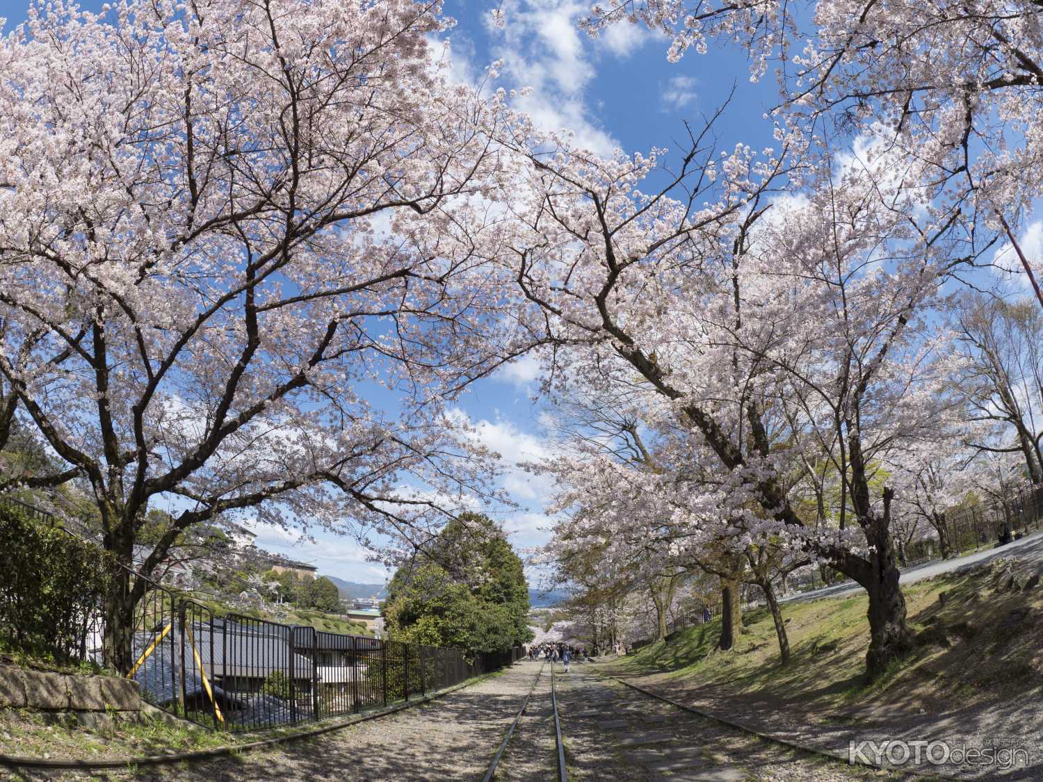 蹴上インクラインは全長582mの世界最長の傾斜鉄道跡です。線路沿いにはソメイヨシノやヤマザクラが植えられており、春には満開の桜並木の中、線路内を歩いて楽しむことが出来ます。