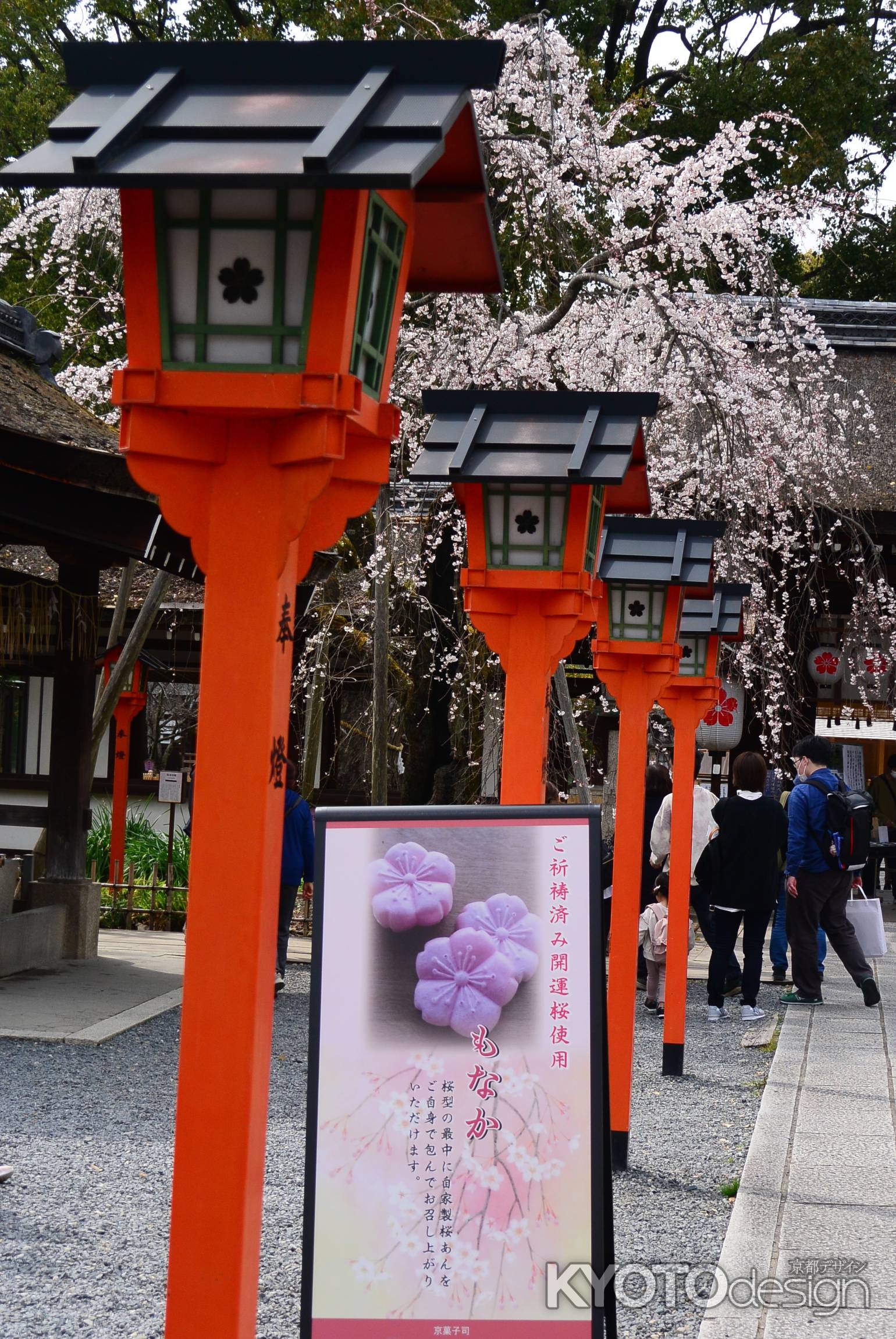 看板は京菓子司 笹屋守栄さんの桜の和菓子(もなか)です