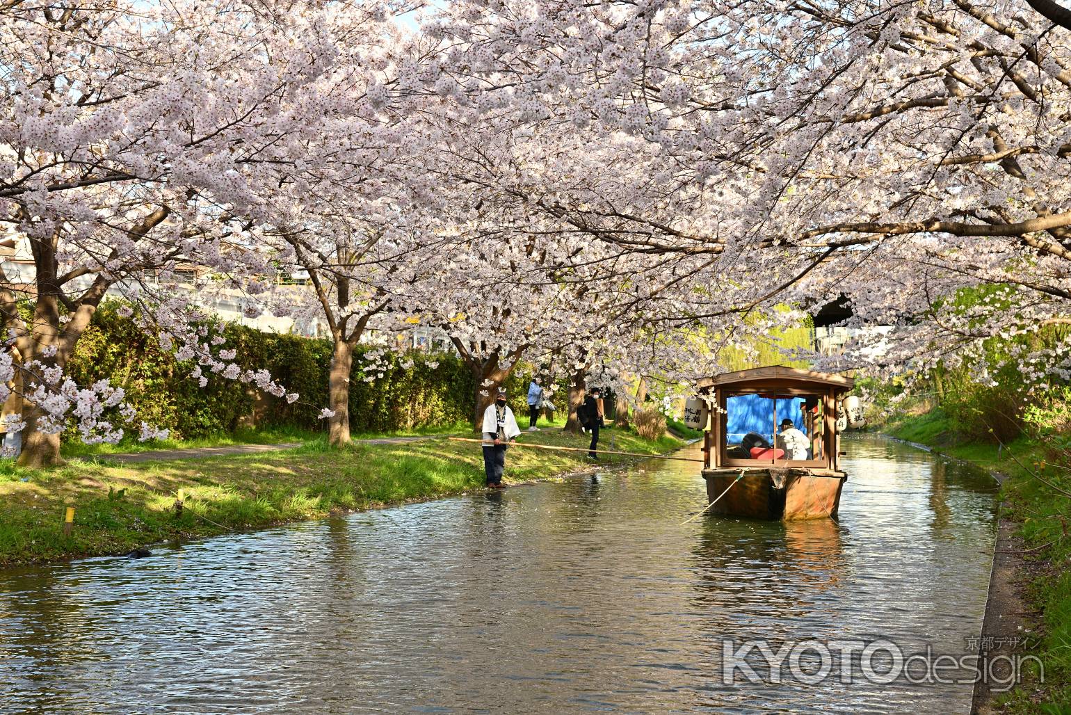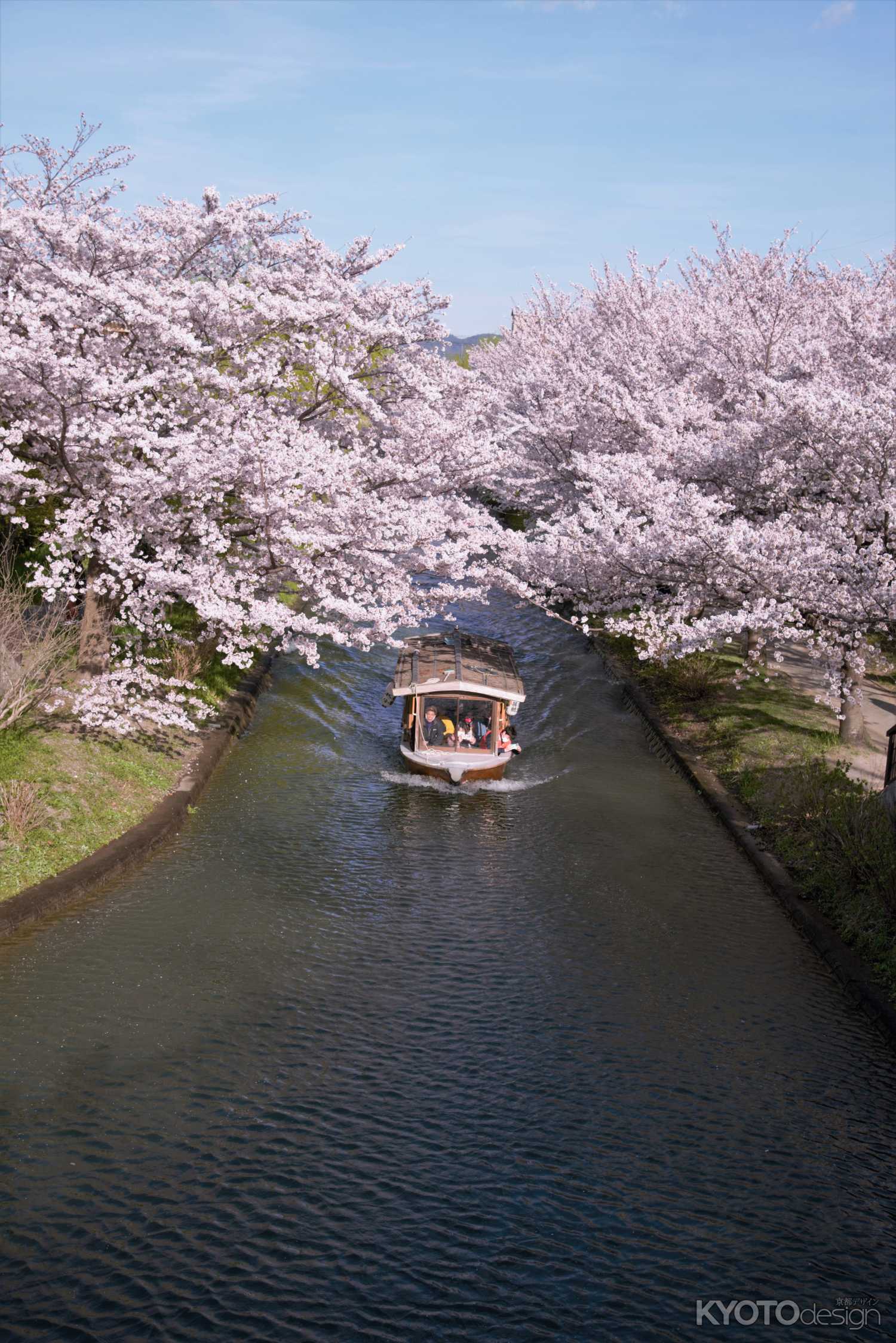 桜並木が満開になる季節には水辺や伏見であい橋から水面を