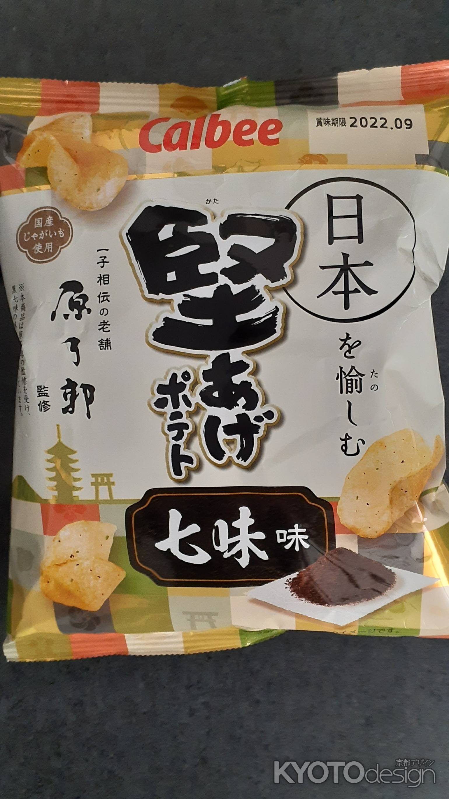 調べてみると…カルビー株式会社は、香辛料を製造・販売する京都衹園の老舗「原了郭」(はらりょうかく)の「黒七味」の味わいを再現した新商品『堅あげポテト 七味味』を、2022年3月7日(月)から全国のコンビニエンスストア先行で期間限定発売(2022年4月中旬終売予定)します。コンビニエンスストア以外では2022年3月14日(月)発売(2022年4月下旬終売予定)。 本商品は、日本各地で大切に育まれた食文化や素材の魅力をお菓子を通じて発信していく「日本を愉しむ」プロジェクトの第2弾商品です。とありました。