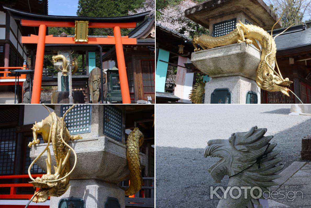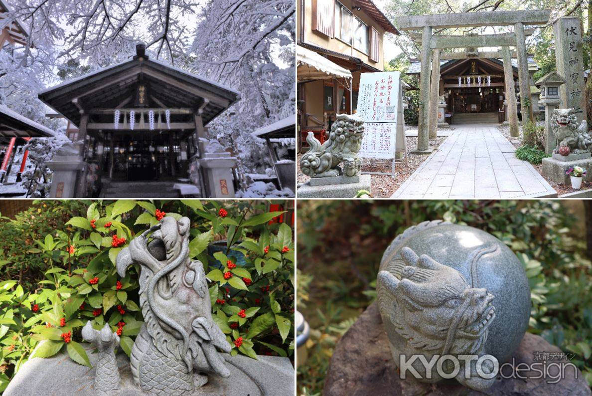 伏見稲荷大社、千本鳥居を過ぎ途中の細道を上がっていくと伏見神寳神社があります。正面に狛龍の「天龍」と「地龍」が鎮座する特徴的な神社です。境内には、たくさんの龍が。
