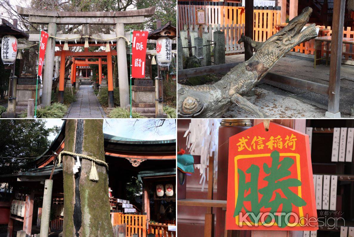 中京区にある武信稲荷神社。商売繁盛、必勝、命名、名付けに御利益があると言われています。境内にある榎のご神木には、坂本龍馬とお龍との逸話が残っています。折落したご神木で龍が彫られています。