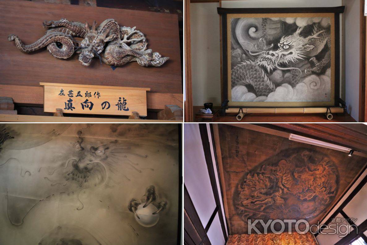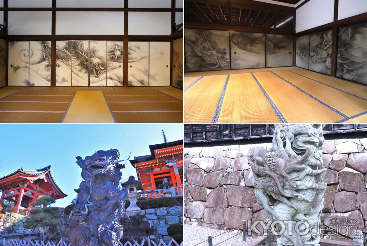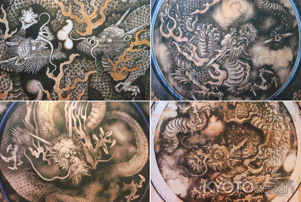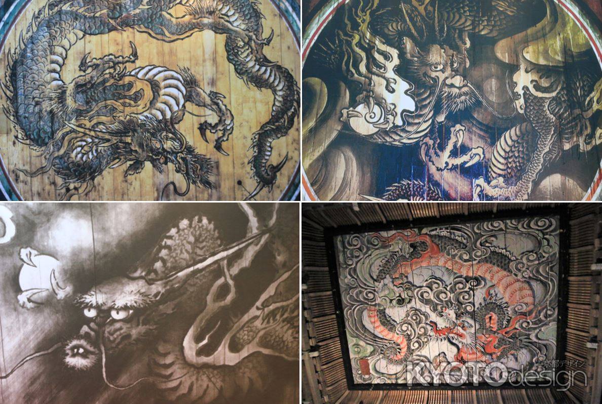 京都には、龍の天井画が描かれたお寺が多くあります。特に大きな龍の天井画には、普通に拝観できる建仁寺、妙心寺。特別公開時に見られる天龍寺、大徳寺、相国寺。中には入れないが外から見ることができる南禅寺、東福寺などがあります。泉涌寺も辰年には公開されるかもしれません。天井龍を見に行くときには事前に調べてから行きましょう。下の龍図(はじめの7図)は、2016年の「禅寺の美-大本山が誇る天井龍」の京都駅地下街でのパネル展示から。