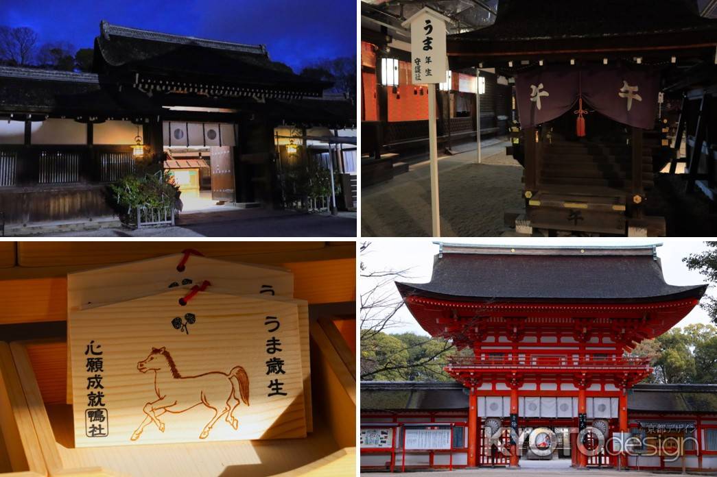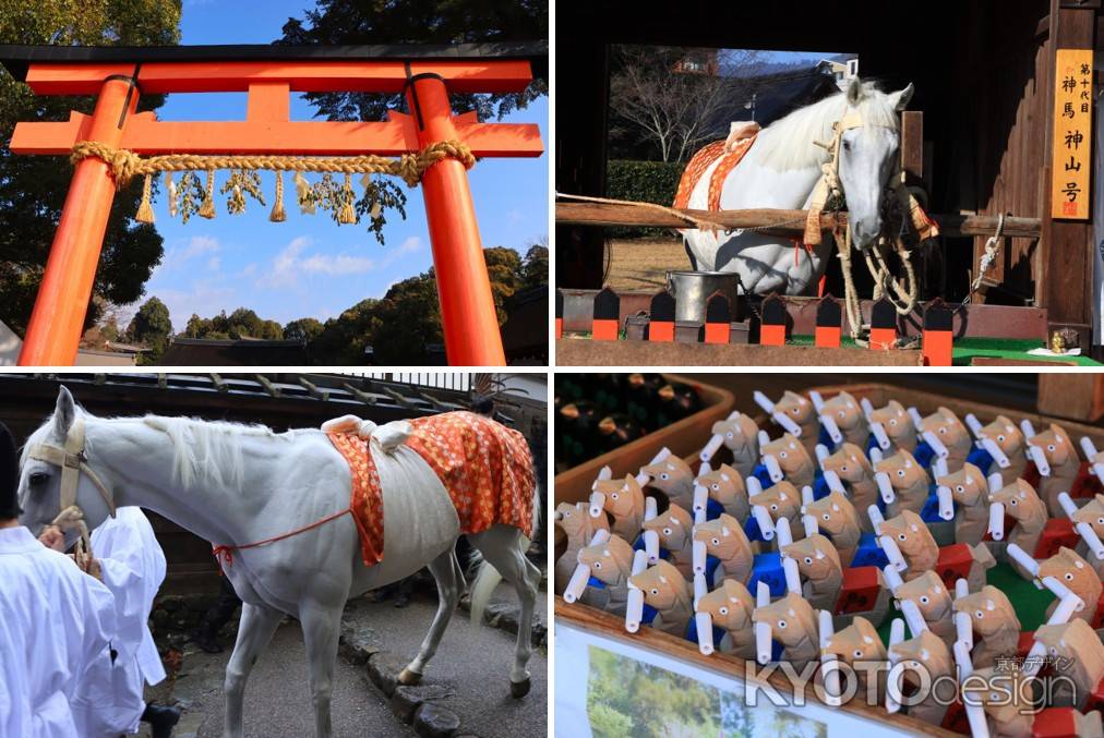 厄除け、方除けの守護神として崇敬を集める賀茂別雷大神を祭神とする上賀茂神社は、馬との関わりが深く、乗馬発祥の地ともいわれており、現在も白馬が飼育されています。また毎年1月7日には、白馬を引いて除災招福を祈る「白馬奏覧神事」が行われています。