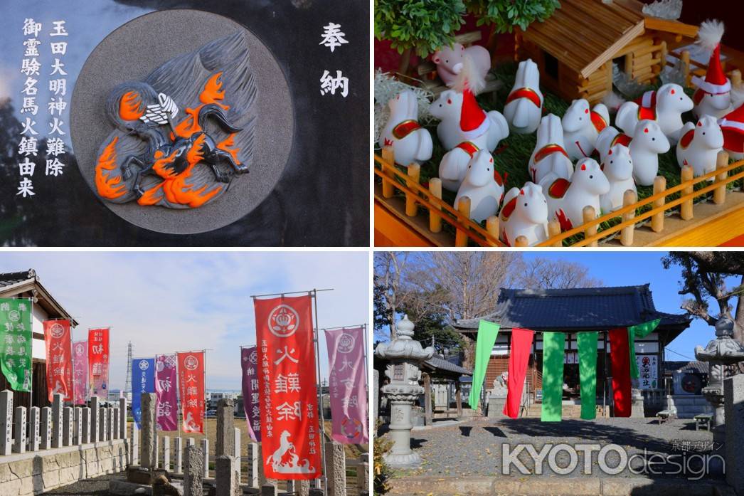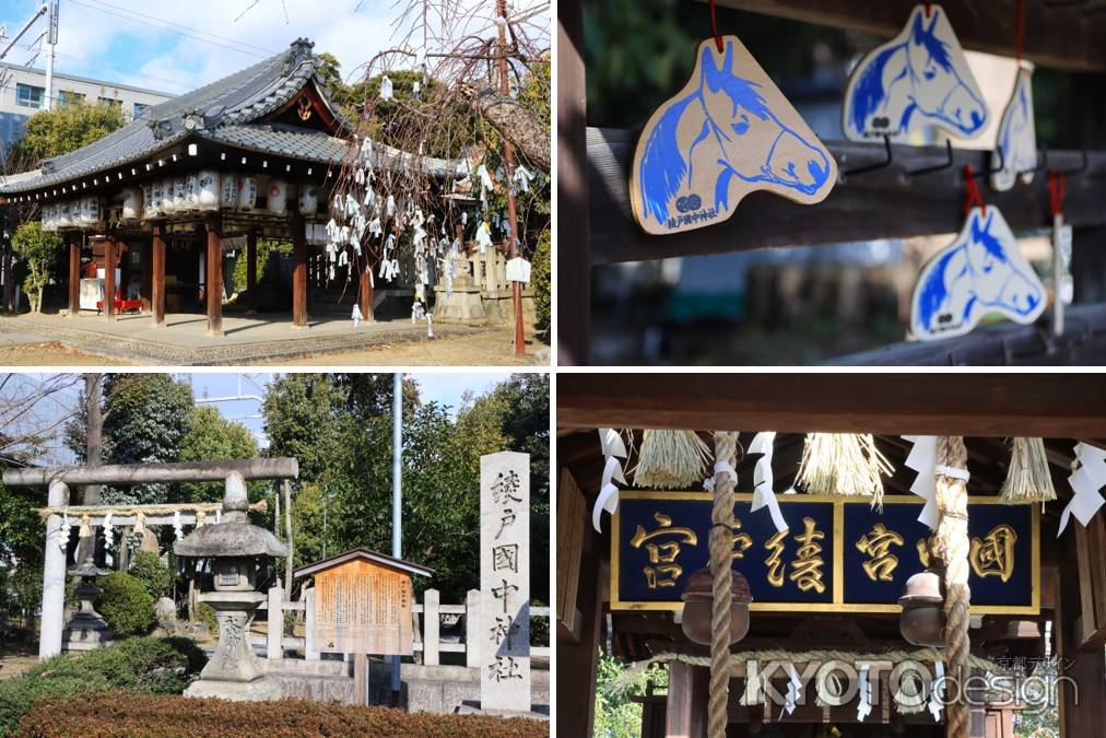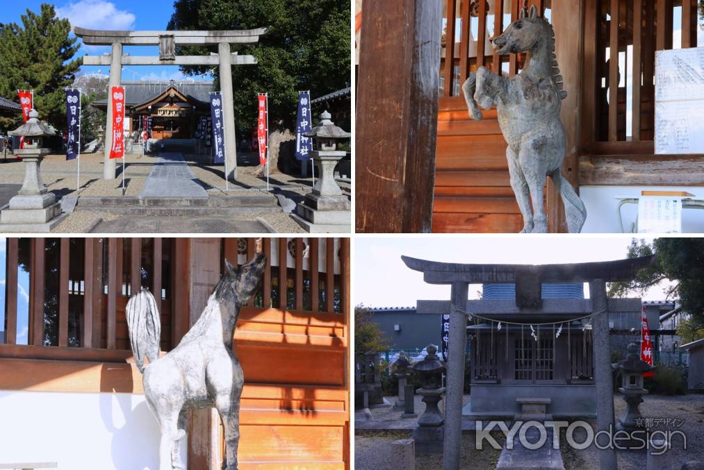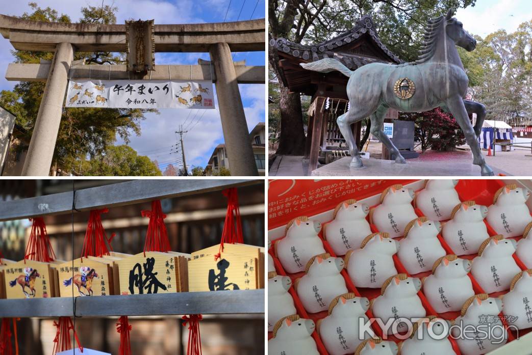 伏見区横大路にあり競馬ファンが参拝する神社として知られ、拝殿前には境内にあった樹齢200年の大木から作られたという雌雄一対の馬の木像が安置されています。また絵馬は、「馬九行久」(=うまくいく)という文字と、九頭の馬の絵が描かれています。