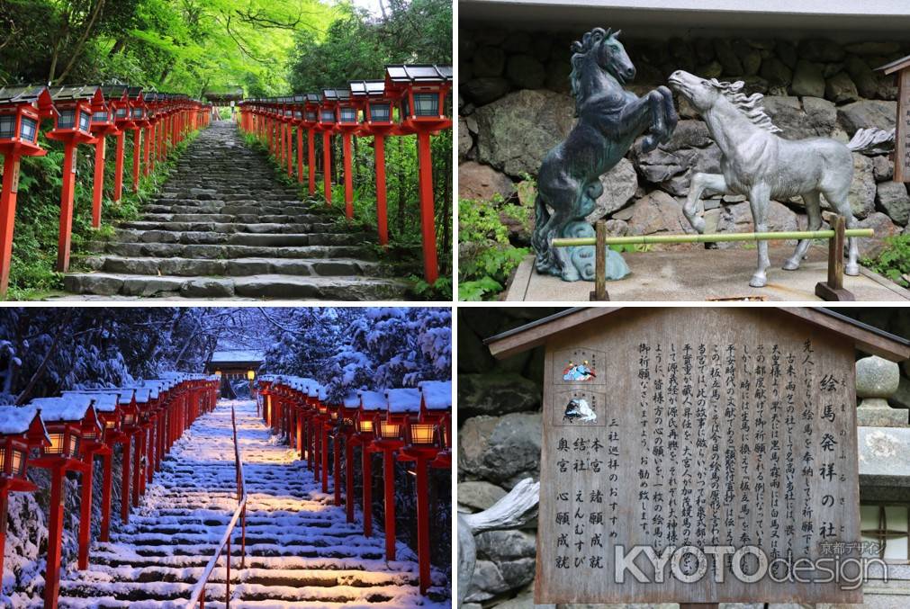 京の水源を守る神として信仰を集め、日照りや長雨が続くと朝廷から度々奉幣使が遣わされ、雨を願う時は黒馬を、晴れを願う時は白馬を奉納されていました。これが今日の絵馬のもととなったとされ、絵馬発祥の地といわれています。