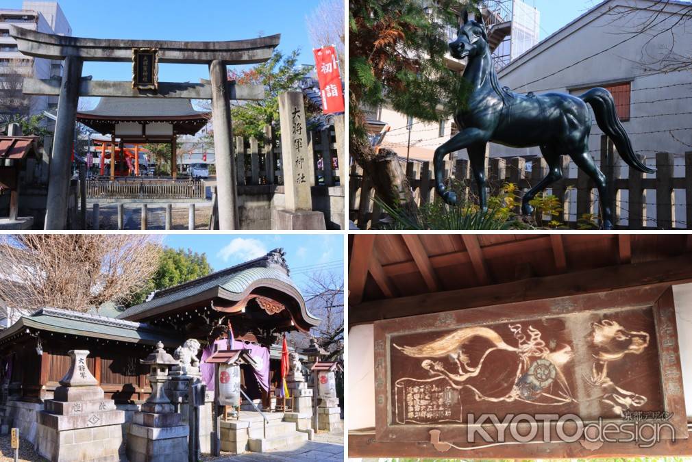 東山区三条にある王城鎮護のため四方に祀った大将軍神社の一つ。方位の神様、厄除けの神様と信仰を集める神社です。この地は、かつて鵺の森とも呼ばれ、源頼政の鵺退治の伝説が残る場所です。境内に立つ馬の像は、源頼政の鵺退治にまつわる馬といわれています。