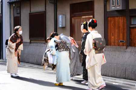 京都の花街で13日芸舞妓さんたちが芸事の師匠やなじみのお茶屋を訪ね 今年1年のお礼と新年に向けたあいさつ…