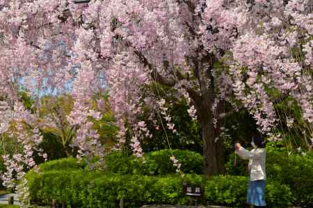 メイン画像は門を少し出たところから撮影致しました 樹齢50年ほどの紅しだれ桜は平安神宮にある紅しだれ桜…