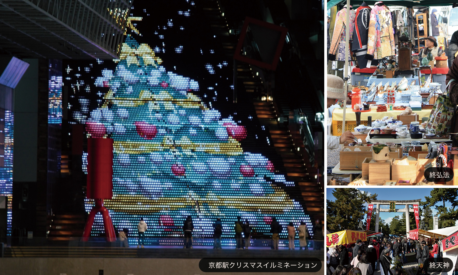 毎年11月25日、京都のシンボルのひとつである南座では「まねき」があげられます。12月13日の「正月事始め」をもって、いよいよ年の瀬です。11月から、紅葉の彩りや多くの寺社の特別拝観も続いている一方で、さらにクリスマスイベント、京都府立植物園、平安女学院などのイルミネーション、ライトアップにより、京都は華やかな煌めきが広がります。一年で最後になる終い弘法、終天神は、いつにも増して大きな人出で賑わいます。このように京都の師走は、伝統的な日本の行事と西洋的なイベントとが重なりあい、独特の雰囲気が醍醐味ですね!