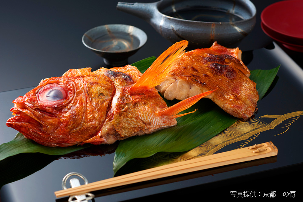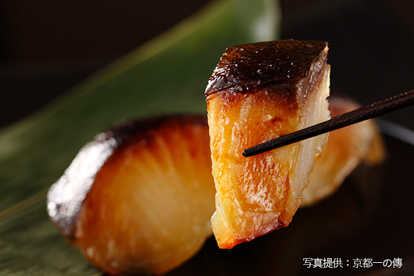 京都一の傳といえば、なんといっても定番の西京漬です。京都一の傳の西京漬について広報の藤井さんにお尋ねしました。「まず魚ですが、最も脂がのる旬の時期に獲れた魚だけを厳選し、おいしい部分だけを贅沢に使用します。その魚を漬ける味噌床は、京都でも有数の老舗から特別に取り寄せた西京味噌、1791年創業の京都・伏見の蔵元である松本酒造の本格派純米料理酒'厨酒(くりやざけ)'、1879年創業澤井醤油本店の'丸大豆2度熟成醤油'、塩の名産地赤穂近海の海水を100%使用した赤穂塩を使用しています。さらに、どなたでも安心して召し上がれるように添加物は一切使用しておりません。また、「蔵みそ漬」は昔ながらの「本漬け」と呼ばれる製法で作っております。丁寧に切り分けた魚をたっぷりの味噌床で二昼夜以上じっくり漬け込みます。その際にはお客様に常に一番美味しい西京漬を提供できるよう、季節や温度、魚の種類、形によって漬け込む時間を調整しております。」とのこと。ものすごいこだわりと職人技です。脂がのってふっくらとした食感の西京漬を口に入れると甘みと旨味が口一杯に広がると共に身がとろけていきます。思わずご飯をかき込みたくなりました。