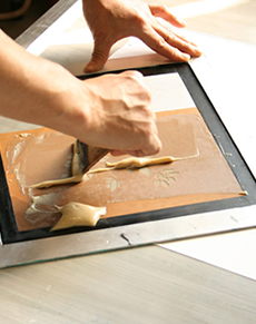 『誰でも気軽に染色に触れていただけるように』と、2011年9月の京都本店増床リニューアルオープンに伴って、染色が体験できるコーナーが新設されました。また、染色作家を講師に招いての講習会を数年前より定期開催、今では技法別に様々なコースを用意し、週に2~3回開催するようになりましたが、直ぐに予約が埋まってしまうほどの大盛況となっています。