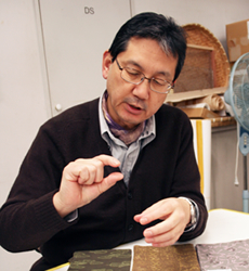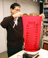 私たちが取材に訪れると、営業終了後の染色実習室で、オリジナルの手ぬぐい染色を楽しんでおられる田中社長。