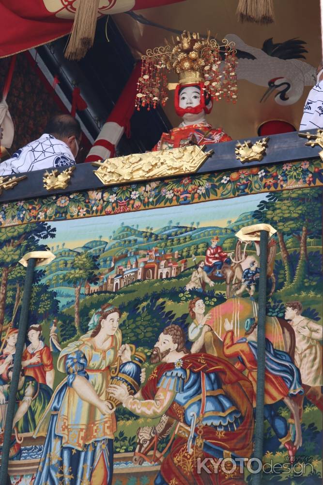 「くじ取らず」で毎年全体では5番目、鉾では長刀鉾に続いて2番目に巡行する鉾。中国の斉の孟嘗君(もうしょうくん)が、秦に追われて函谷関までやってきたときに、家来に鶏の鳴き真似をさせたところ、それに呼応して本物の鶏が泣いたため、門が開いて助かったという故事により、この名がつけられました。鉾頭の三日月と山型は山中の闇を表し、孟嘗君が祀られた下には、雌雄の鶏がいます。昔は生稚児を乗せていましたが、現在は一条実良(明治天皇の妃の兄)がモデルの「嘉多丸」という稚児人形が乗っています。