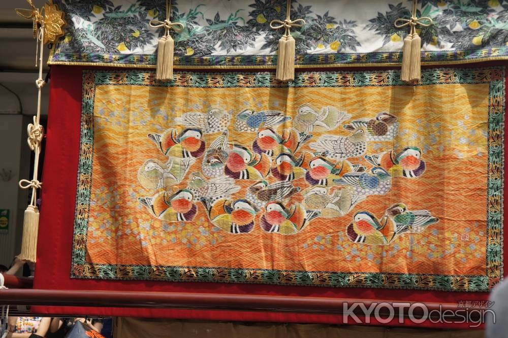 大蟷螂を屋根に乗せた御所車が特徴。鯨髭をバネにした糸で操られながらダイナミックに動く蟷螂は、南北朝時代、強大な足利義詮の軍に「蟷螂の斧」さながら立ち向かい戦死したある公家の話を、梁の時代の中国の昭明太子の詩文集にある「蟷螂の斧」の一節となぞらえて題材となりました。舁き手が持つ舁き棒は、蟷螂山独特の、漆の朱色が黒色から透けている溜色です。
