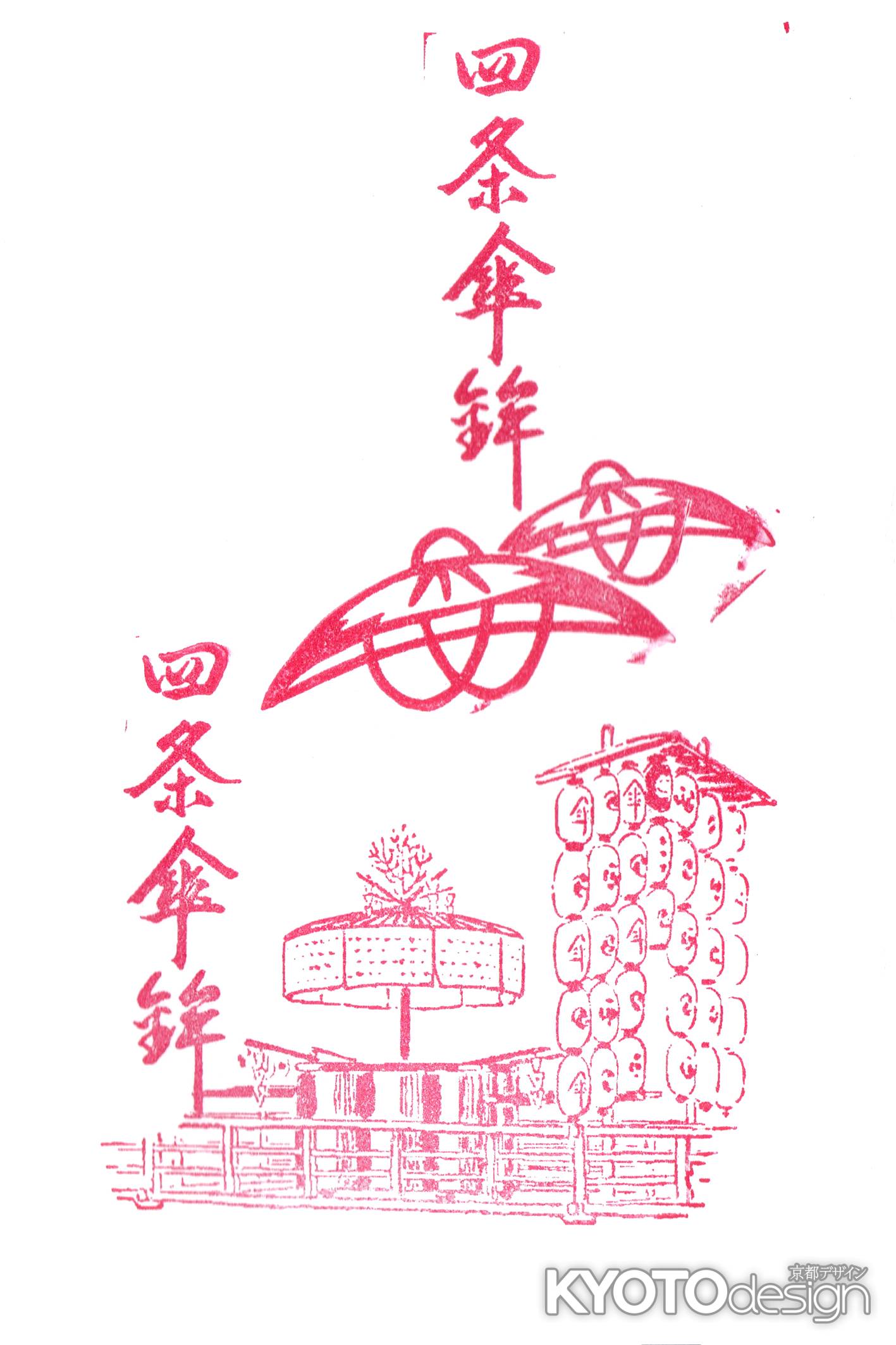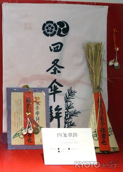 傘の上に、赤い御幣がつけられた赤松の若木が載せられています。傘の垂りは、魔除けのための七色の雲の中を鳥が飛ぶ姿がみられます。四条傘鉾のお囃子はゆったりとして、鉦、太鼓、ササラを奏でる子どもたちと、赤熊と振袖袴で棒振り踊りをする子どもたちが巡行します。