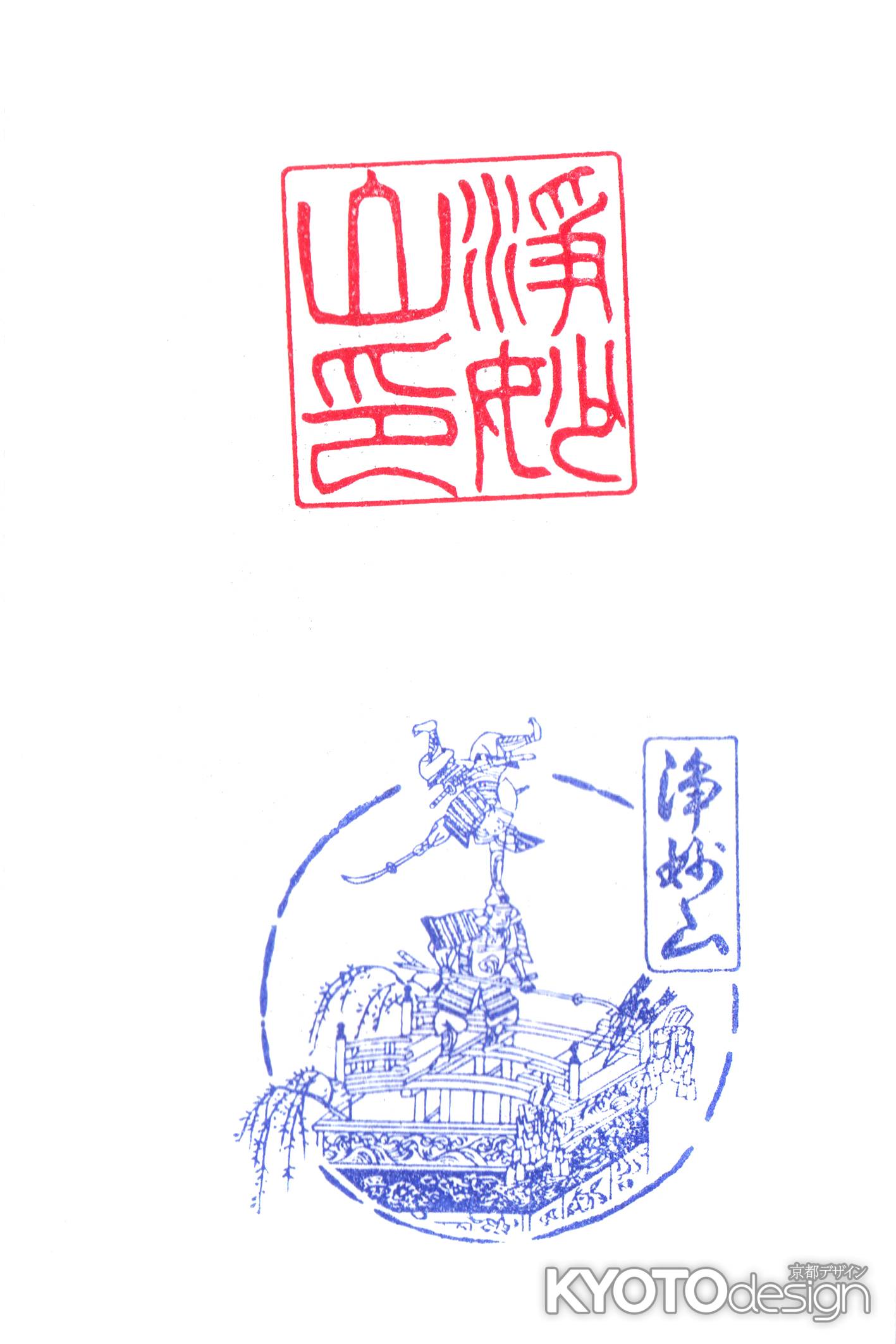 平家物語にある源平合戦「宇治川の合戦」で、源氏方が宇治橋の橋桁を外してしまったため、平家方が前に進めずにいたその時、源氏方の一来法師が筒井浄妙の頭上を片手で飛び越して、平家の敵陣に一番乗りを果たすその瞬間を切り取っています。一来法師の口が開いているのは、この瞬間に「悪しゅう候、御免あれ」と、浄妙に声を掛けているからだといいます。欄縁の波の彫刻、後ろにつけられた柳と、宇治川の流れを彷彿とさせます。